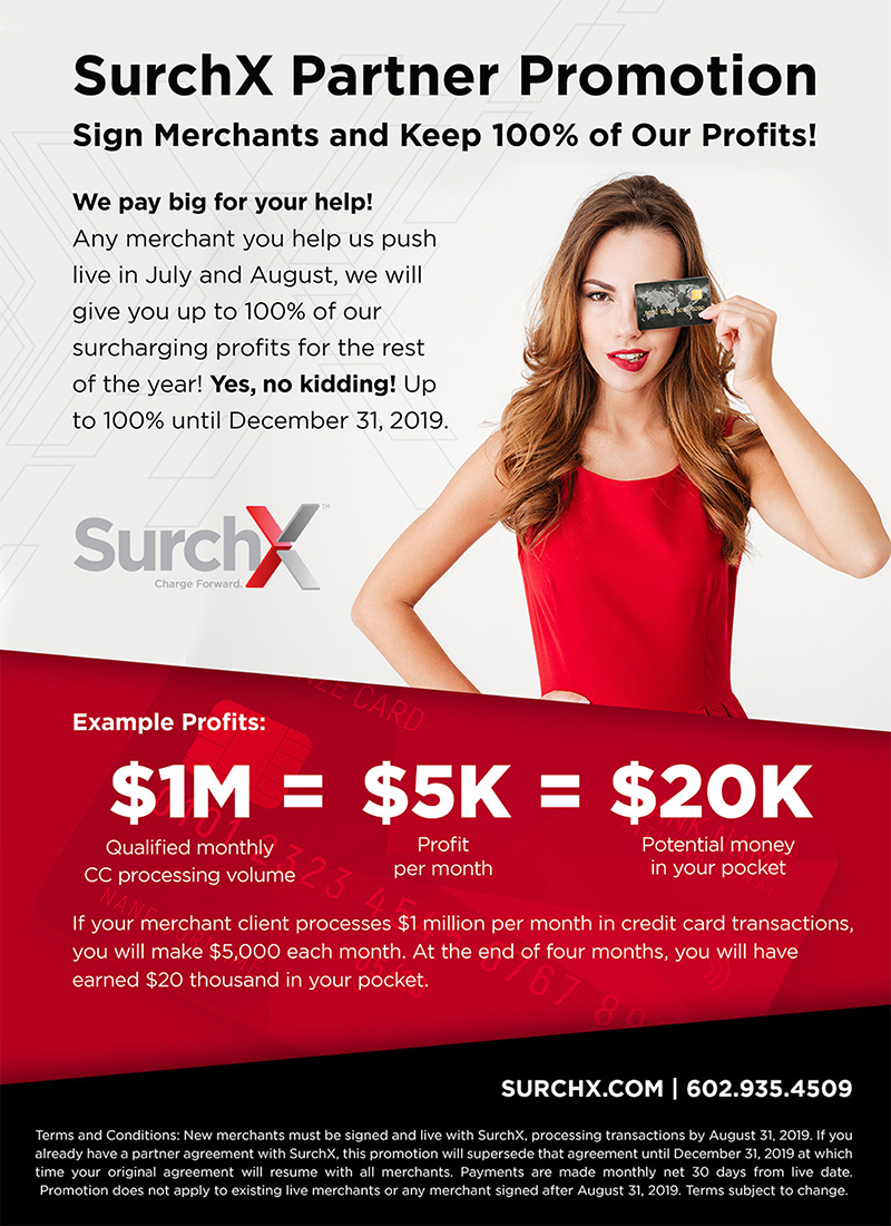 An informational magazine ad for SurchX, detailing Surcharging and the recovery of Processing credit card fees.